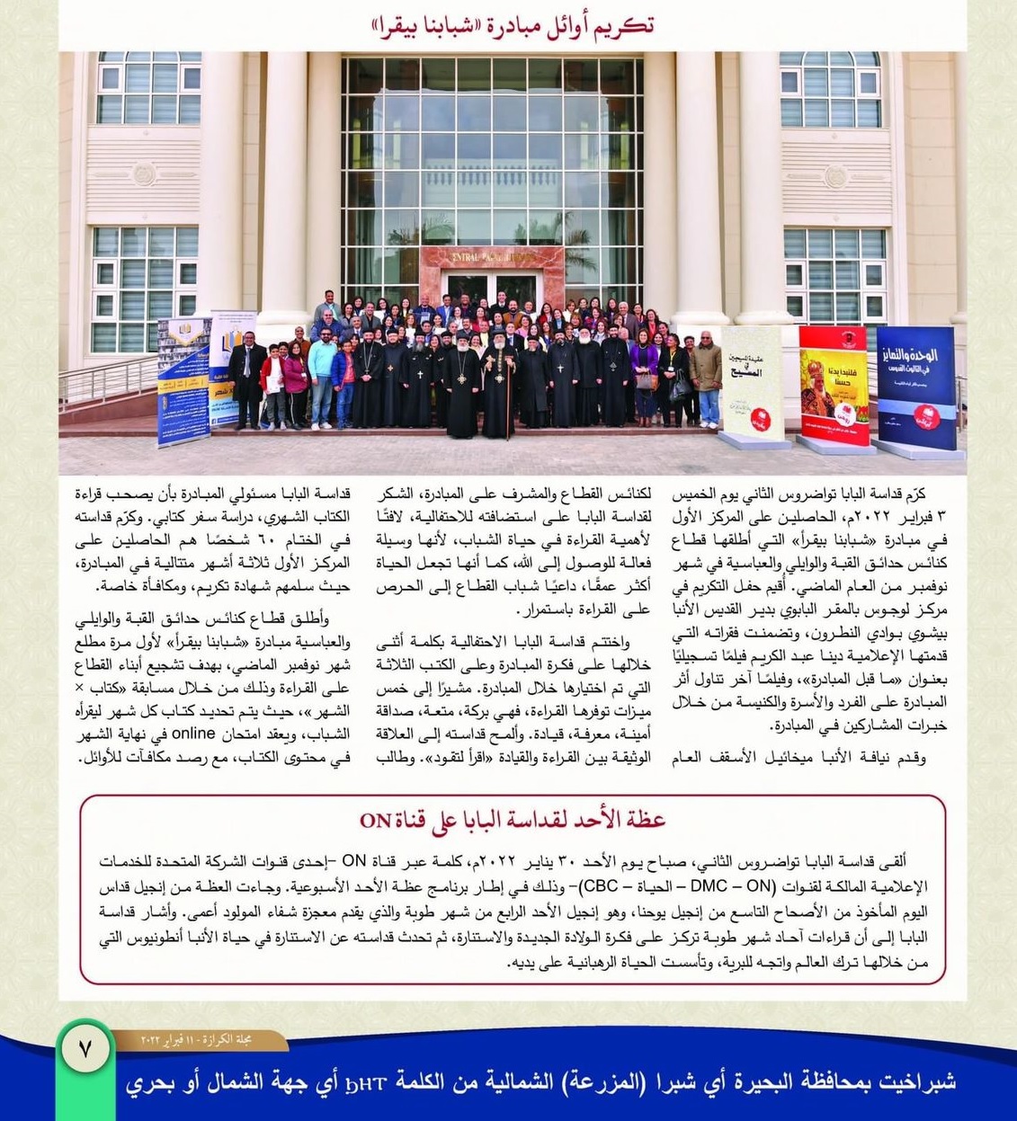 أطلقت كنائس منطقة القبة والوايلي والعباسية، مبادرة “شبابنا بيقرأ”، تحت رعاية نيافة الحبر الجليل الأنبا ميخائيل الأسقف العام والمسؤول عن القطاع، و أعلن نيافته أن المبادرة تختص بقراءة كتاب روحي كل شهر وفي نهاية الشهر تكون هناك مسابقة أون لاين على الكتاب، ويتم توزيع جوائز قيمة على كل الفائزين.